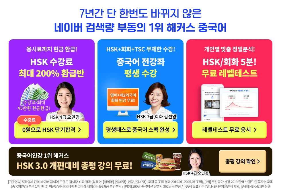 수많은 합격생이 해커스를 선택한 이유 [만족도] 해커스중국어 2020 강의 수강생 대상 설문조사 취합 결과 [베스트셀러] 교보문고 외국어 베스트셀러 HSK/중국어시험 분야 (2020.06.26 온라인 주간집계 기준)